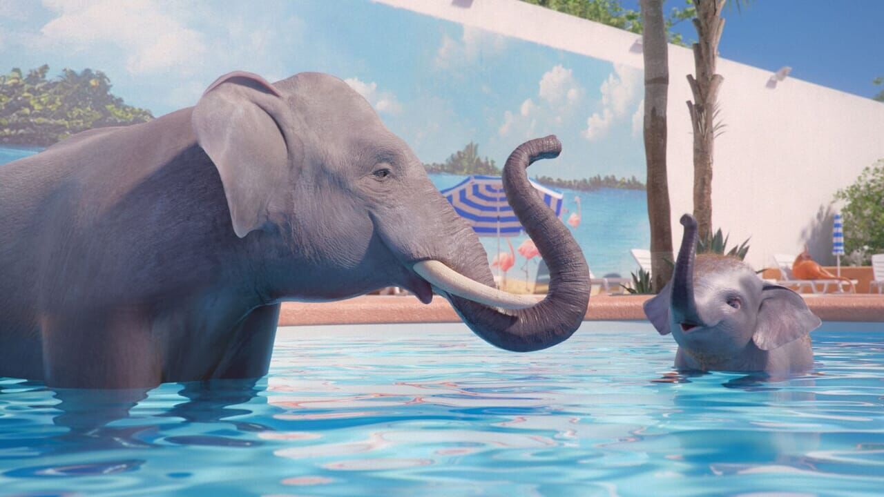 Un père éléphant partage les émois de son éléphanteau à qui il apprend à nager.