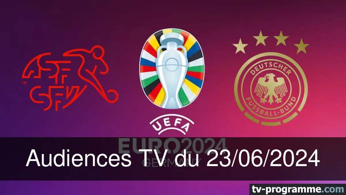 24/06/2024 22/06/2024Ce soir-là, M6 est arrivé en tête avec "Suisse - Allemagne - Football Euro 2024 2024", devant TF1 avec "Titanic" et France 3 avec "Les enquêtes de Vera".