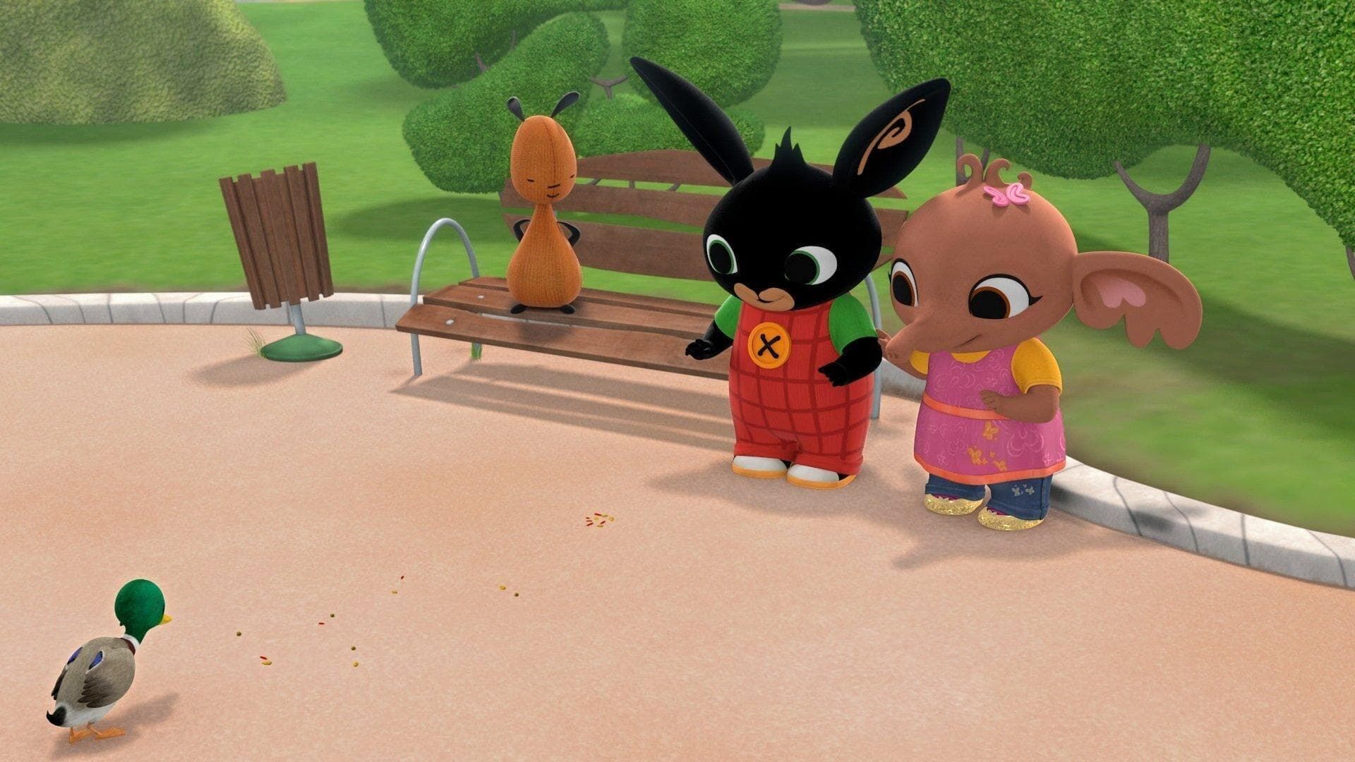 Bing veut nourrir les canards. Pour ne pas leur faire peur, il essaie de rester immobile comme une statue. Il réussit à tenir jusqu'à l'arrivée d'une oie...