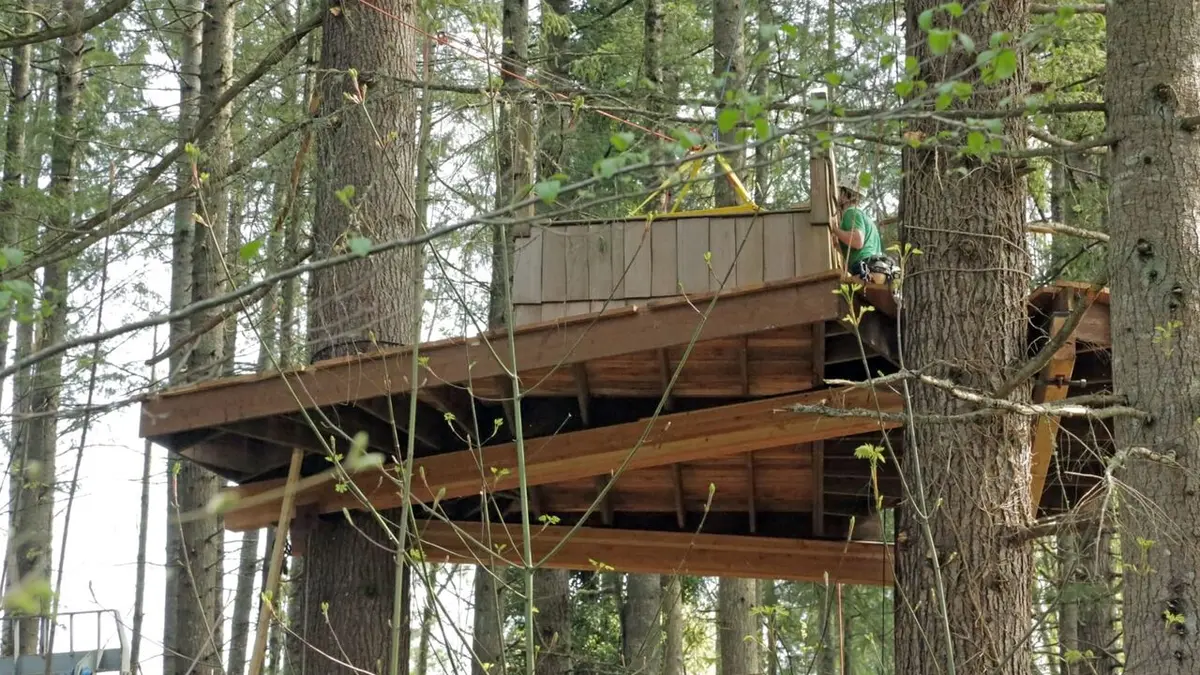 Pete Nelson offre à sa fille un cadeau inoubliable pour sa maison: une cabane perchée dans les arbres d'inspiration marocaine. Installée entre les branches de trois énormes sapins, elle dispose d'une grande terrasse, de toilettes sèches extérieures et de tout un système d'échelles de cordes pour y accéder.