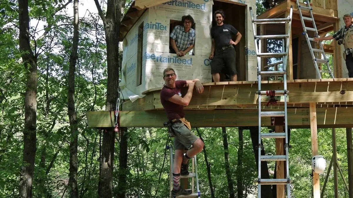 Pete construit une cabane qui ressemble à un nichoir pour un couple à la retraite : il aménage trois pièces et crée une terrasse qui surplombe leur enclos d'alpagas.