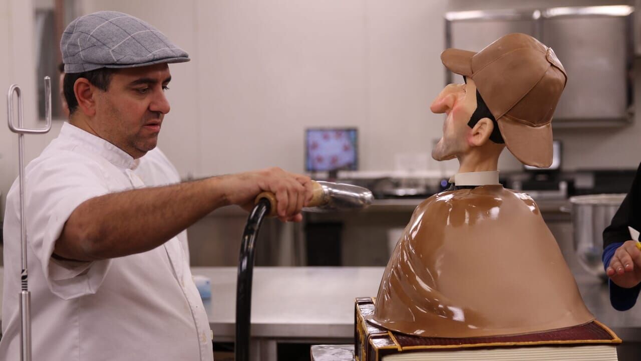Buddy prépare un gâteau pour des fans de Sherlock Holmes. Il s'inspire du détective britannique, avec son chapeau et sa loupe emblématiques.
