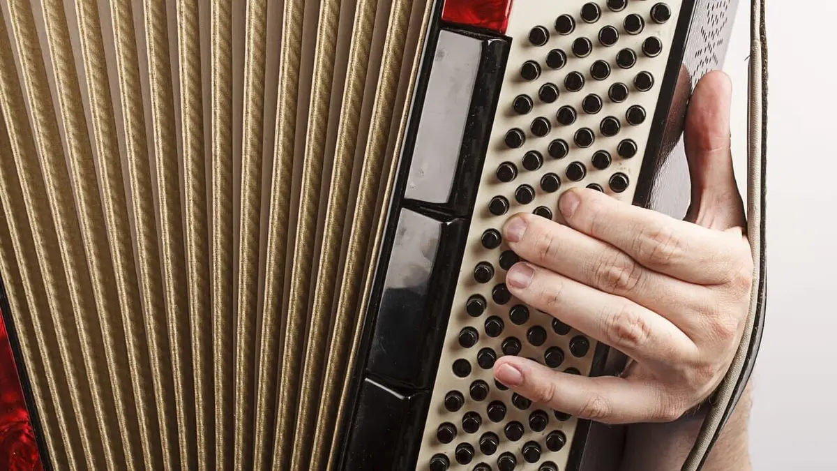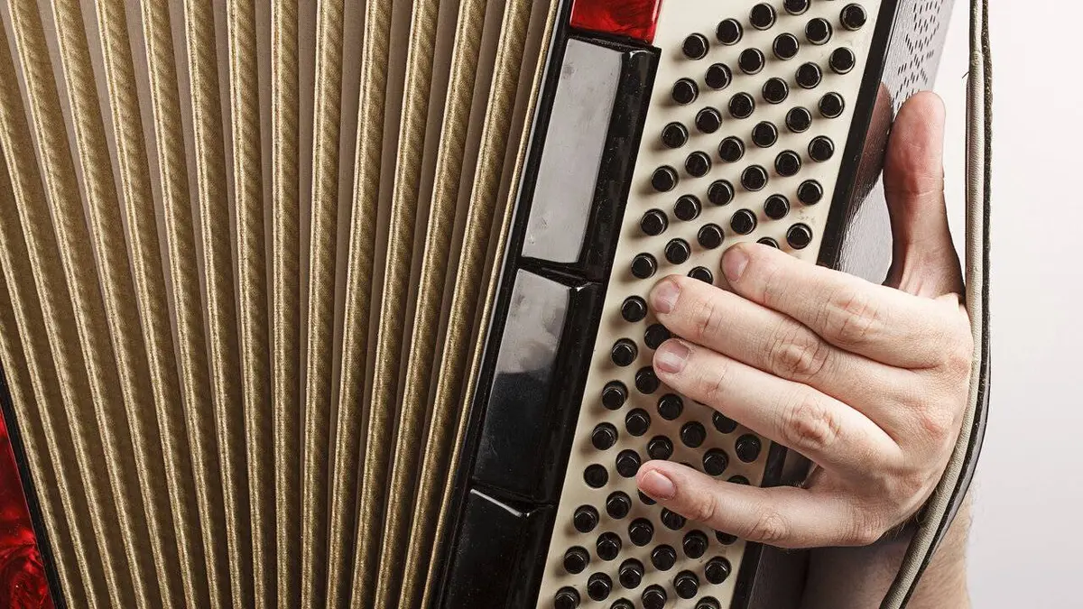L'accordéon est un instrument de musique à clavier, polyphonique ; en actionnant le soufflet, le musicien fait vibrer les anches : gros plan.