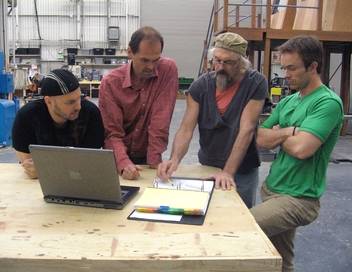 L'équipe forme deux groupes pour construire un chariot autopropulsé ; l'assemblage des pièces, tel que pensé par Léonard de Vinci, requiert une extrême précision.
