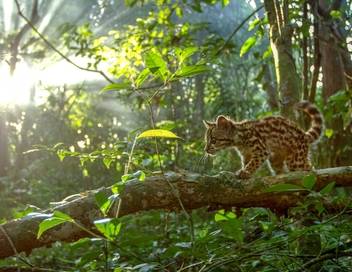 Plongée dans la forêt tropicale du Guyana, à la découverte d'une espèce menacée par la destruction des forêts tropicales : le margay, ou chat-tigre.
