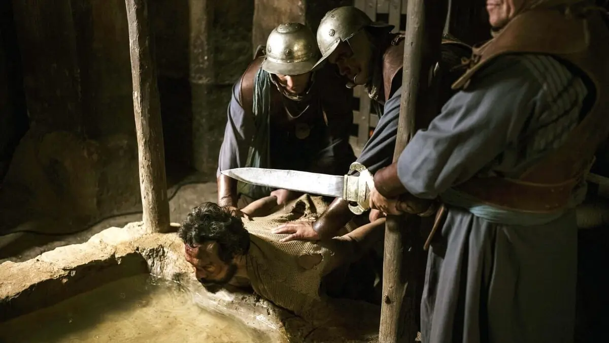 Des historiens mettent en perspective la vie de Jésus, illustrée par la mise en scène des témoignages de personnages l'ayant connu : ici, le prophète Jean parle de sa rencontre avec celui qu'il a baptisé dans les eaux du Jourdain.