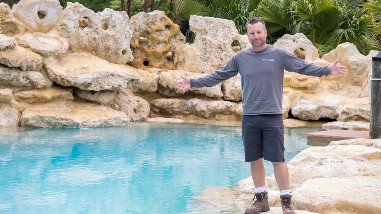 Lucas construit une immense piscine pour un ami. Il crée un jardin de rêve avec un dock, de grandes cascades, un brasero et un bar flottant.