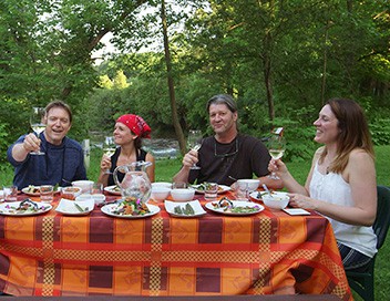 Nancy Hinton à la table des Jardins sauvages, propose entre autres des ravioli de foies blonds aux baies de sureau, sauce aux morilles, pousses d'hémérocalle, gingembre sauvage et panelle à la quenouille.