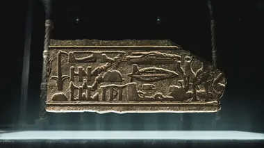 Gros plan sur la célèbre machine cryptographique allemande Enigma, et sur de mystérieuses et anciennes marques découvertes sur une porte en pierre.