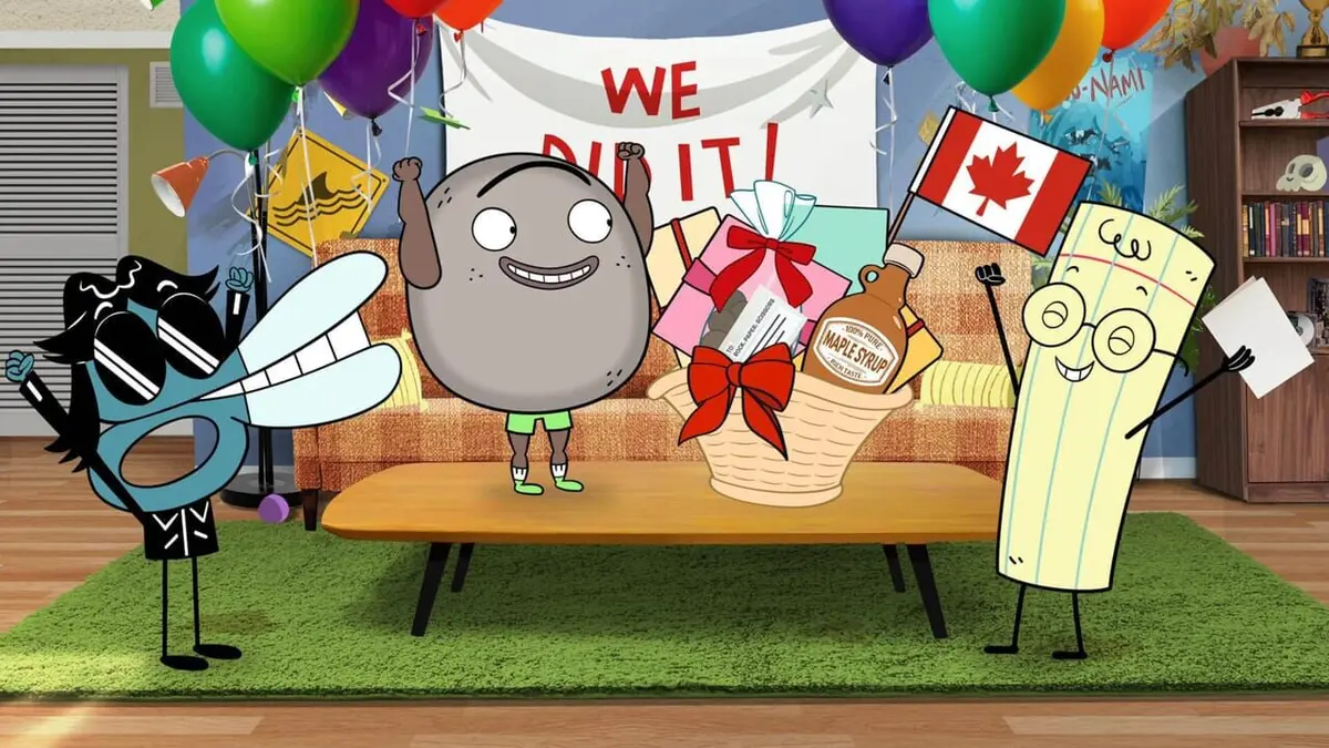 Pierre, Feuille et Ciseaux, trois colocataires inséparables et chamailleurs, partagent leur quotidien, mais aussi leurs petits tracas qui prennent vite des proportions gigantesques. Entre une séance de cache-cache à travers le monde, un affrontement contre les Rats Musclés ou encore un plan pour défendre la planète contre une invasion extraterrestre, les trois amis affrontent toutes les situations, même les plus absurdes, toujours dans la bonne humeur et avec humour.
