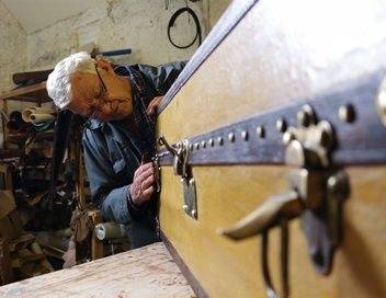 Je supprime la publicitéSaxon Durrant, un antiquaire d'Anglesey, tente Martin Ashworth, artisan du cuir, avec une malle garde-robe Louis Vuitton des années 1920 incroyablement rare.
