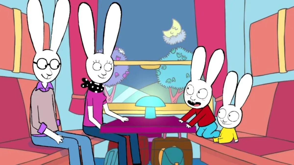 Je supprime la publicitéToute la famille prend le train pour aller à la montagne. Simon est ravi car ils vont dormir dedans. Il aime aussi les tunnels qui permettent à Simon d'apparaître et de disparaître comme le fantôme du train, ainsi que les sandwichs du wagon restaurant. Après avoir pique-niqué dans leur compartiment, les enfants sont maintenant prêts à se coucher. Les dents et au lit dans les couchettes qui se déplient comme par magie. Puis, au petit matin après une douce nuit, ils découvrent émerveillés la montagne à la fenêtre du train qui arrive…