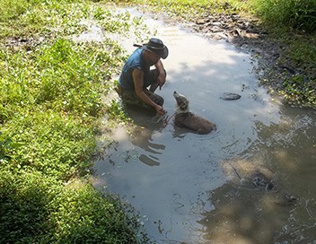 Ernie Brown Jr, surnommé «l'homme tortue», accompagné de son ami Neal James et de sa chienne Lolly, présente les espèces animales du Kentucky.