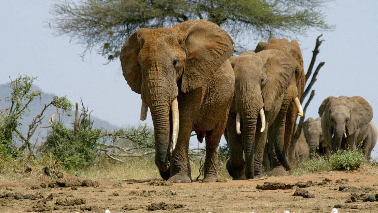 Parc national de Tsavo, au Kenya. Lorsque la saison sèche s'installe, tous les animaux convergent vers les derniers points d'eau disponibles.